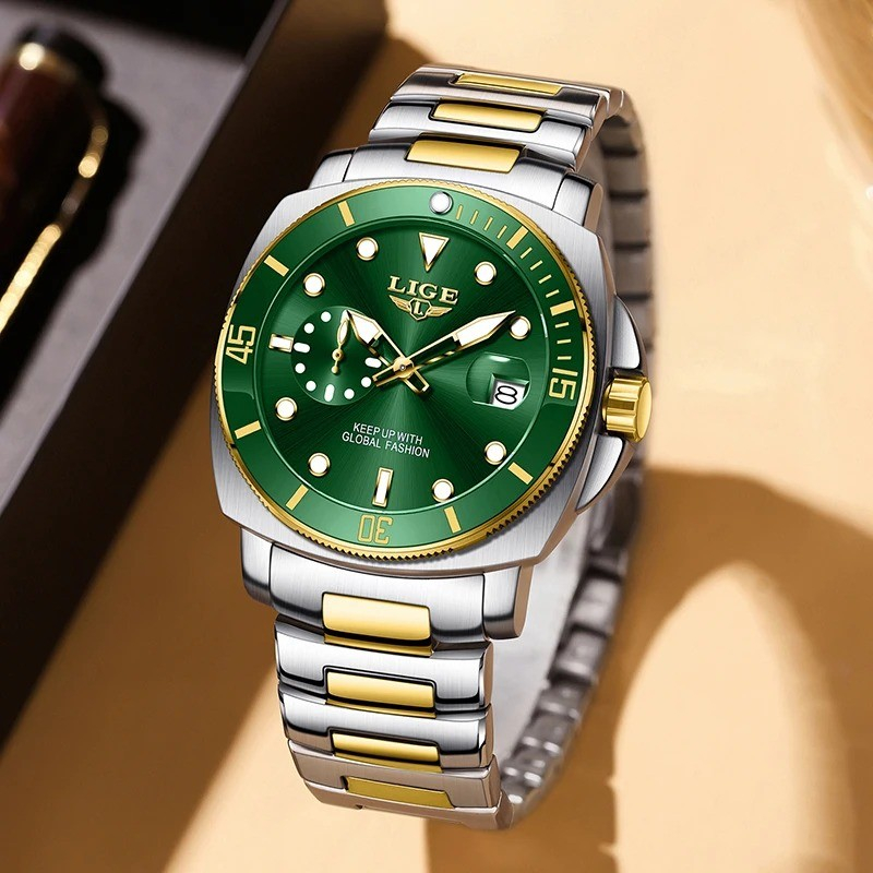 LIGE 89287 Green Luxury Men's Quartz Watch 30M Waterproof Luminous Stainless Steel Business Casual Wristwatch
