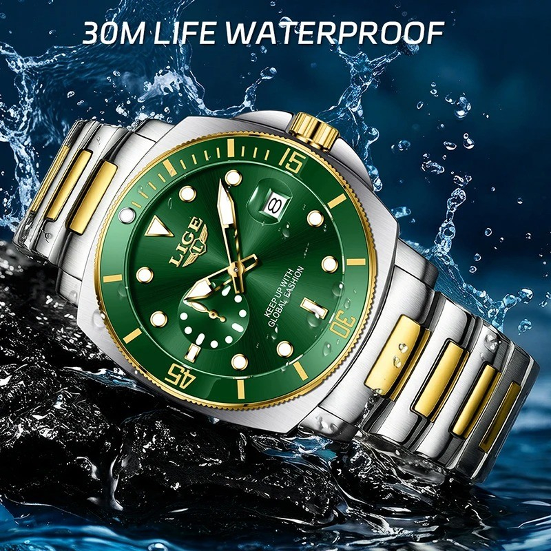 LIGE 89287 Green Luxury Men's Quartz Watch 30M Waterproof Luminous Stainless Steel Business Casual Wristwatch