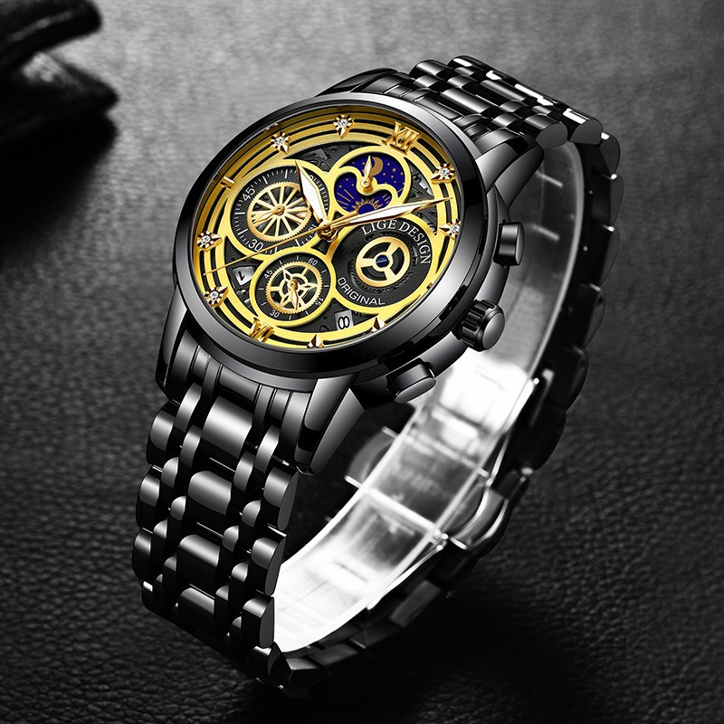 LIGE 8942 Mens Watches Top Brand Luxury Skeleton Quartz Wristwatch Fashion Business Stainless Gold Watch