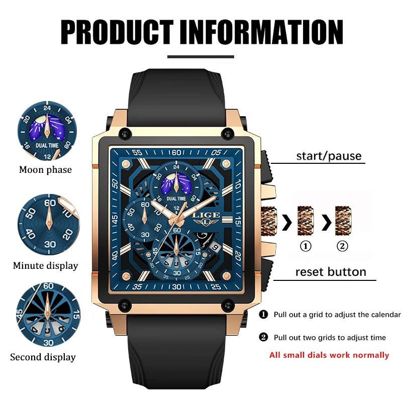 LIGE Mens Silicone Strap Waterproof Watches Top Brand Luxury Hollow Square Sport Watch